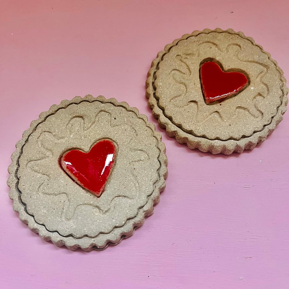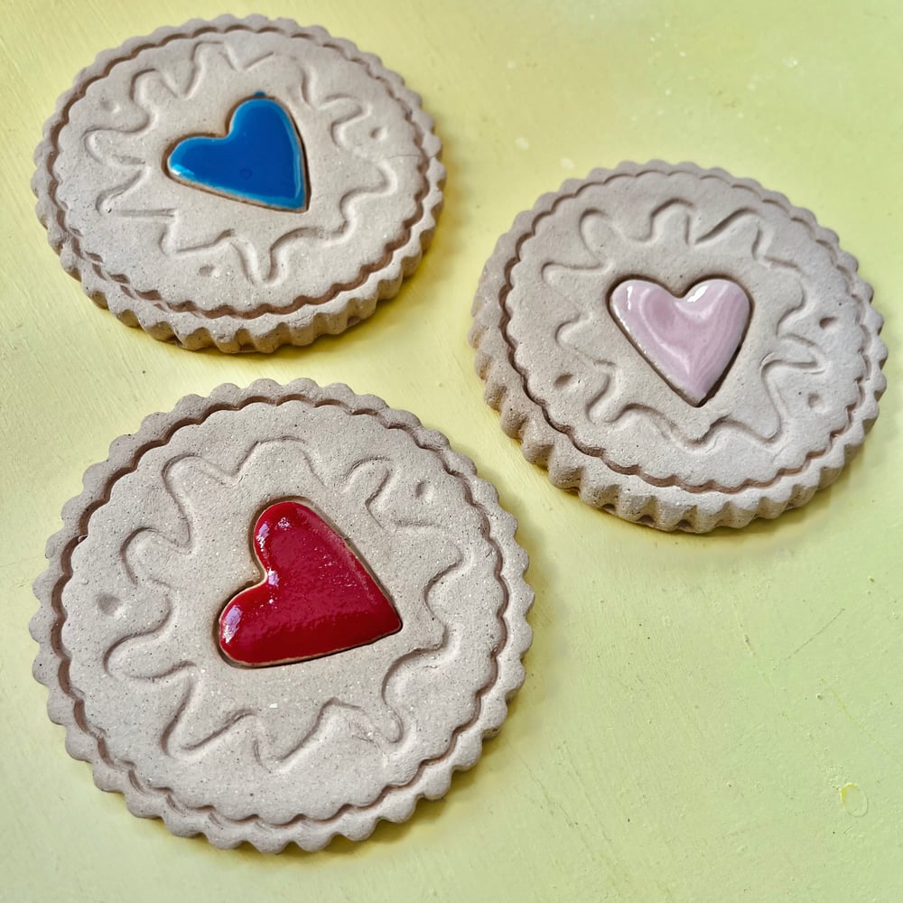 Made from a light, shortbread looking clay with the iconic splodge design. The Jammy heart is fully glazed in either a classic glossy red, pastel pink or blue. Love hearts all around.
