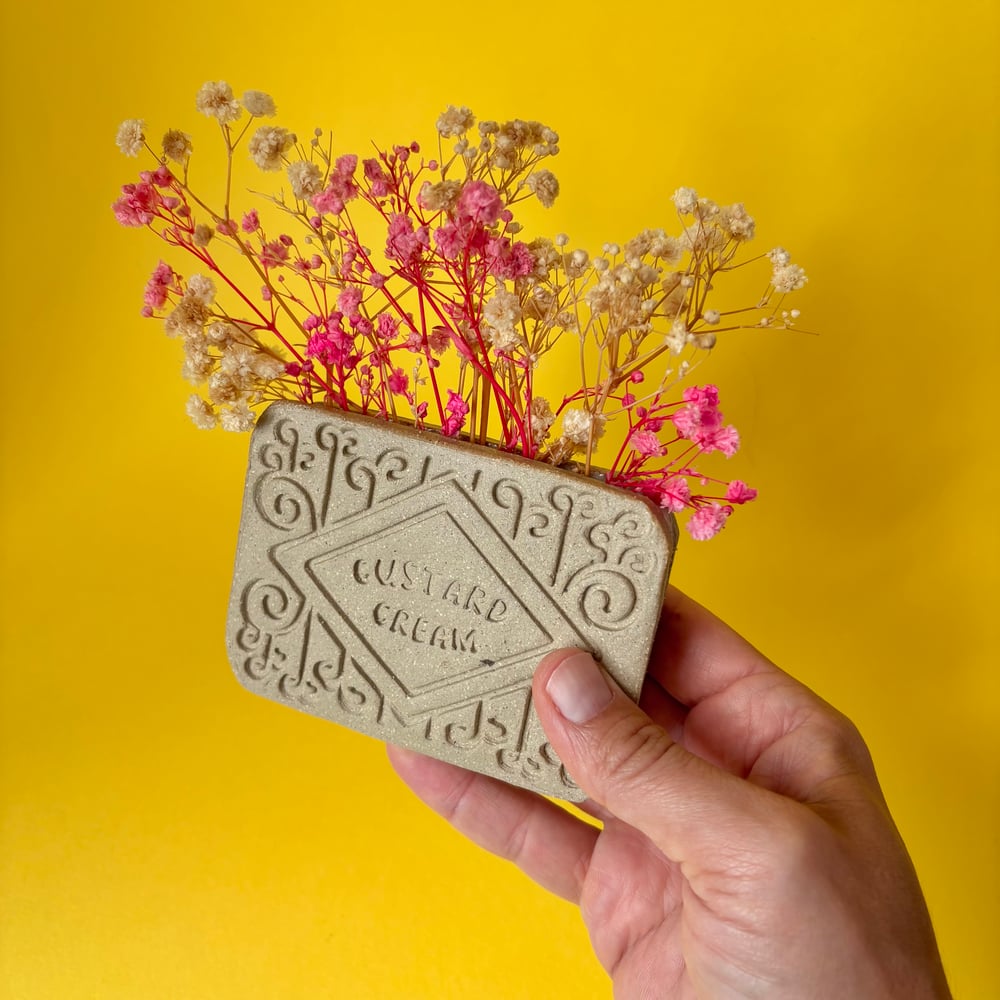 Each vase is double sided with the iconic custard cream pattern on both sides. The middle has a creamy white glaze going around and inside. The top has a long slot to help arrange your little blooms (or whatever you want to use it for)
