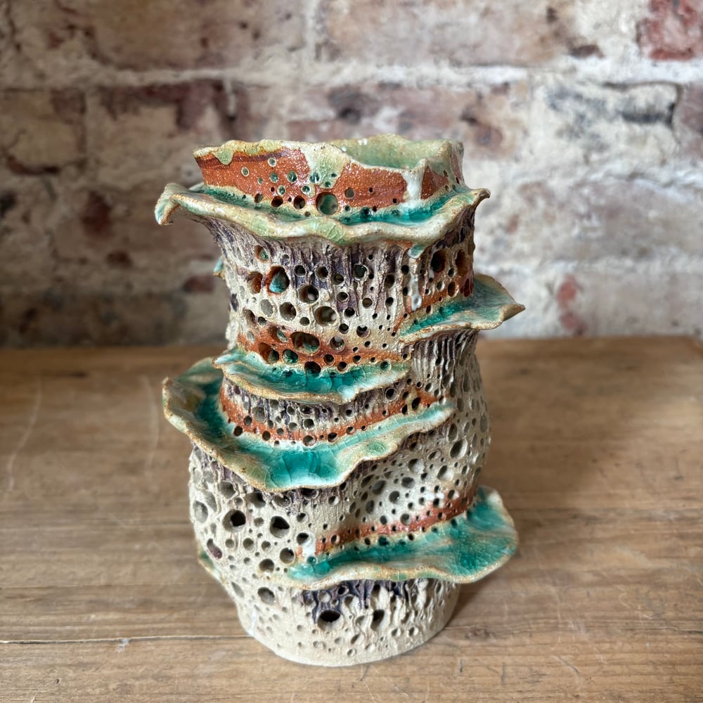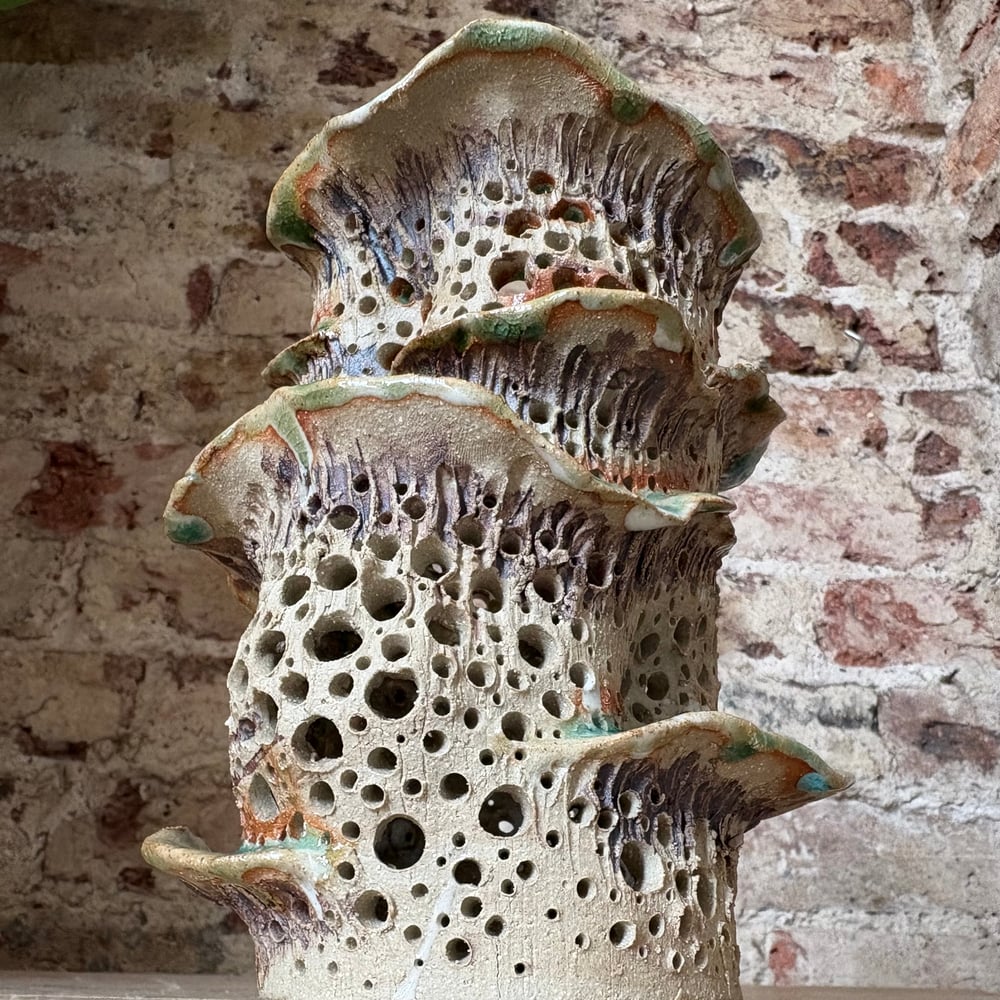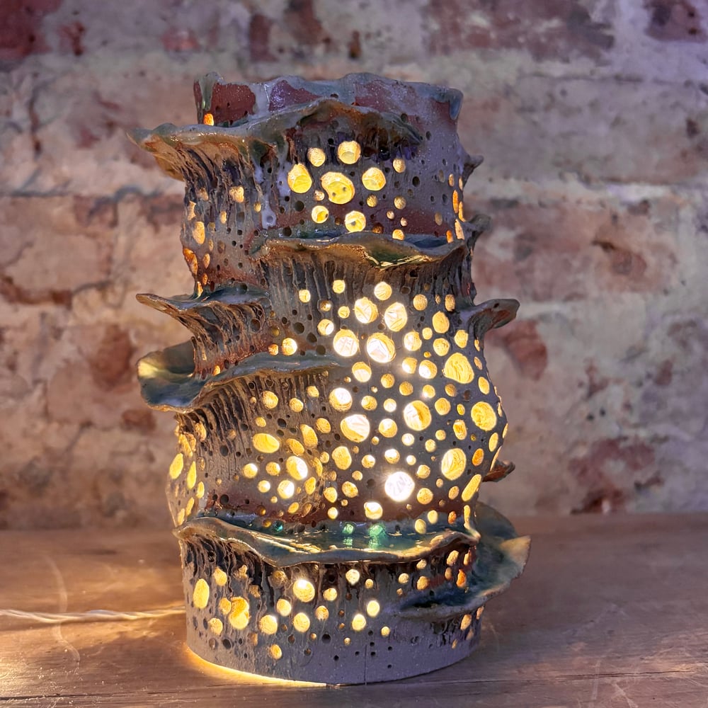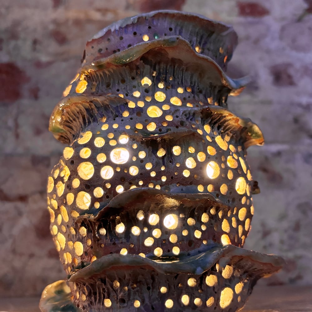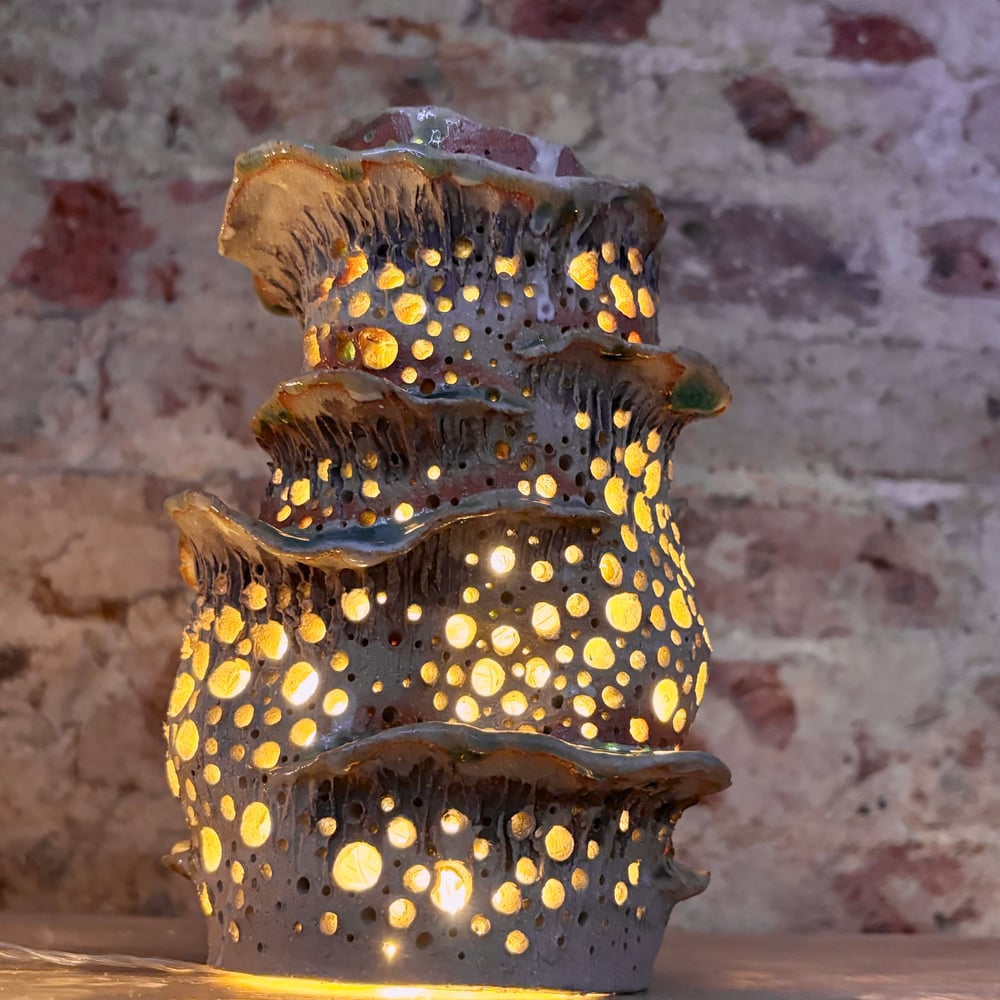 Inspired by all things nature, woodland and fairy! This ceramic light piece is covered in glossy glazed fungi and delicate perforations in a organic pattern. The contrast between the earthy ceramic left rough and the smooth glaze is one of my favourites!