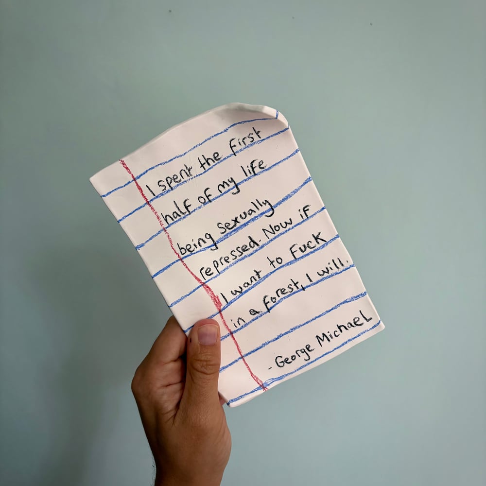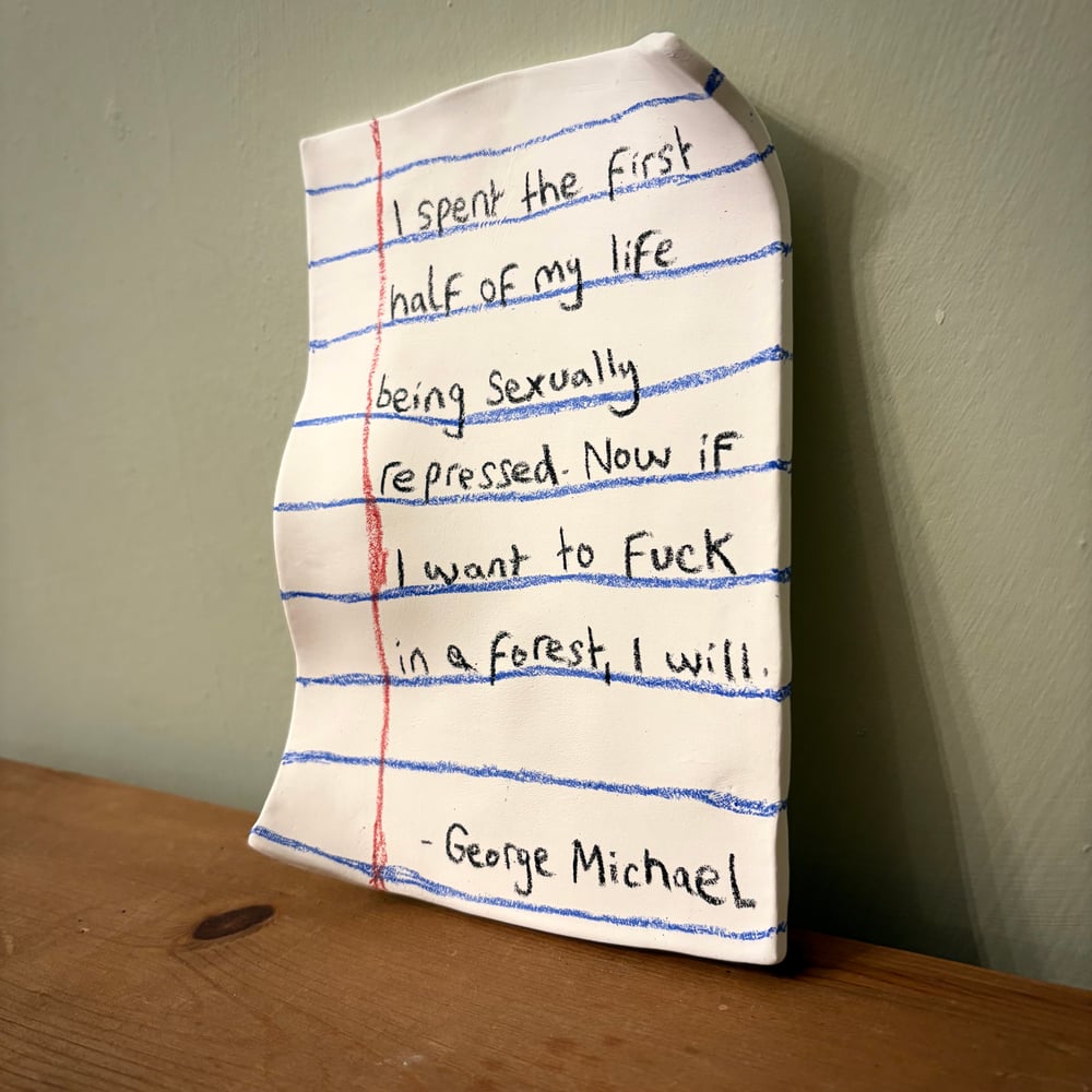 This ceramic note is the George Michael gay note pieces from Instagram. These are fine porcelain with underglaze pencil decoration. I’m so happy with how these have come out and have worked hard to make each one striking and well finished. The high quality smooth white clay is fired twice up to 1,260 degree which makes the glaze look so vibrant with the papery wobble and lines baked into the piece.