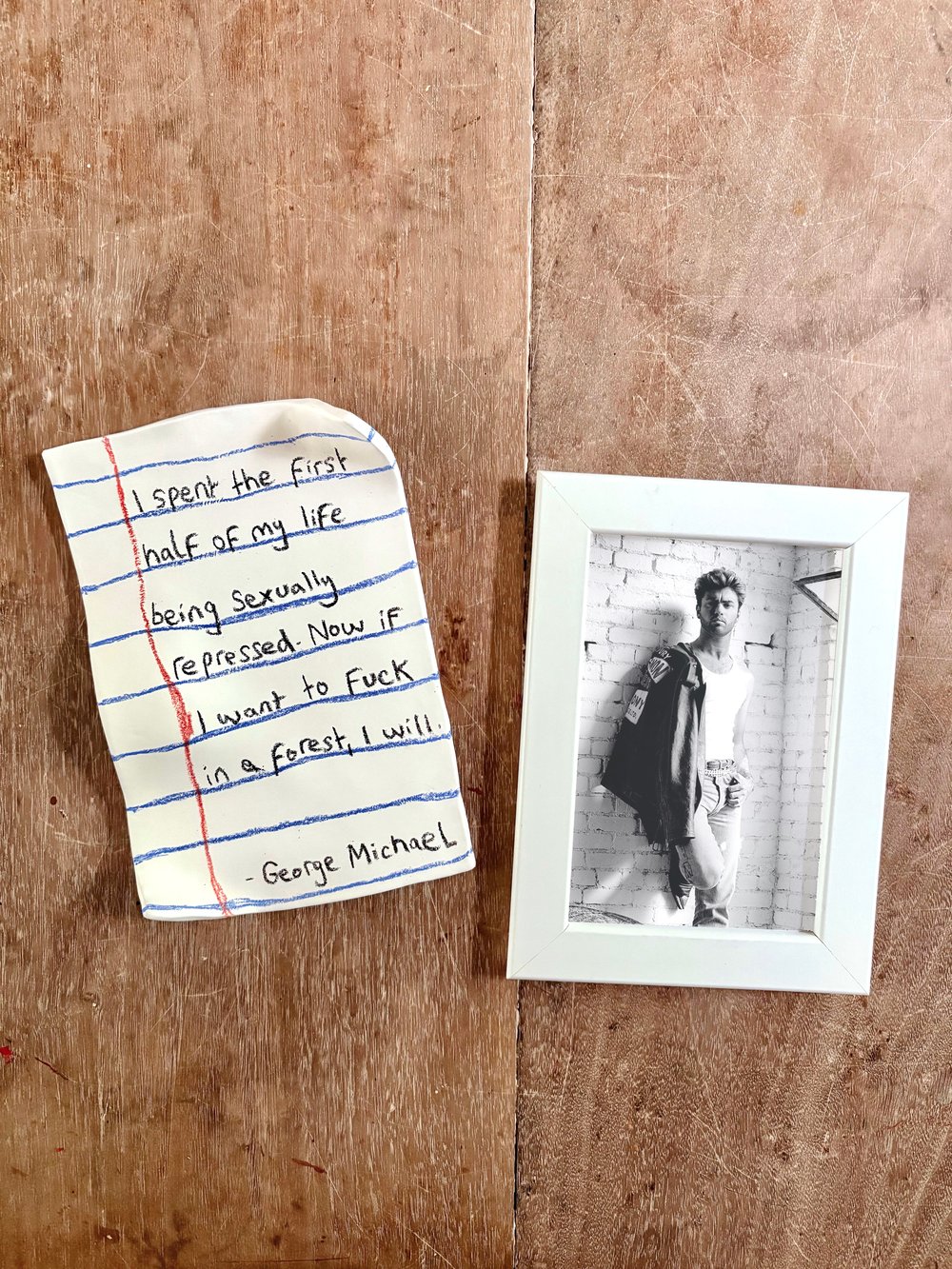 George Michael was a proud gay man and unapologetically sex positive. He wasn’t ashamed of the less media friendly parts of gay culture and I wanted to honour him with his quotes made permanent in fine porcelain pieces. He was an icon that paved the way for many.