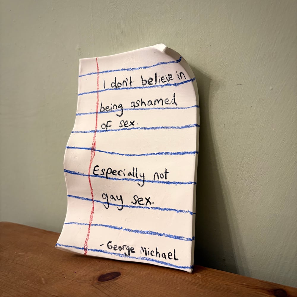 This ceramic note is the George Michael gay note pieces from Instagram. These are fine porcelain with underglaze pencil decoration. I’m so happy with how these have come out and have worked hard to make each one striking and well finished. The high quality smooth white clay is fired twice up to 1,260 degree which makes the glaze look so vibrant with the papery wobble and lines baked into the piece.