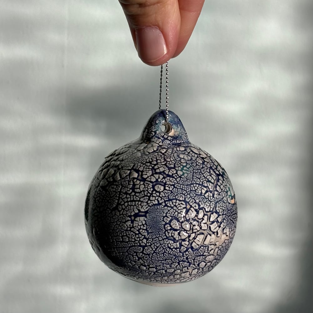 The slipcast bauble is finished with metallic twine to hang on your tree or decorating around the house. They have a small bare bottom patch so the glaze doesn’t stick to the kiln.